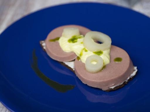 Oksespegepølse med remoulade, rå løg og karse (gratin)
