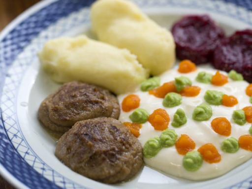 Frikadeller med stuvede ærter og gulerødder, kartofler, persille og syltet rødbede (gratin)