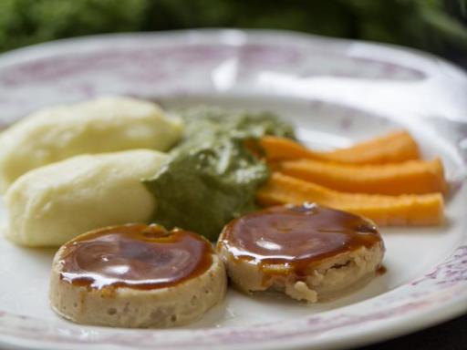 Glaseret hamburgerryg med stuvet grønlangkål, kartofler og bagte gulerødder (cremet)