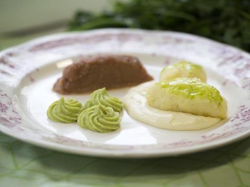 Når der er almindelige kartofler på menuen, kan mosen formes med en varm ske, så det ligner almindelig kartofler. Kom evt. en urteolie ovenpå kartoflerne for at skabe noget farve i retten. Kan også anvendes som kolde kartofler til smørrebrød.