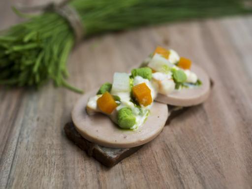 Oksespegepølse med remoulade, rå løg og karse (gratin)