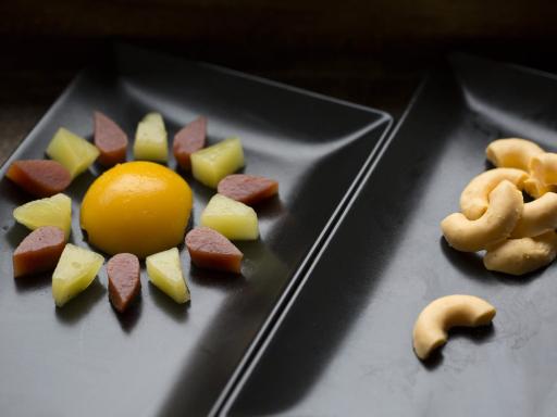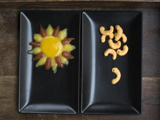 Oksespegepølse med remoulade, rå løg og karse (cremet)